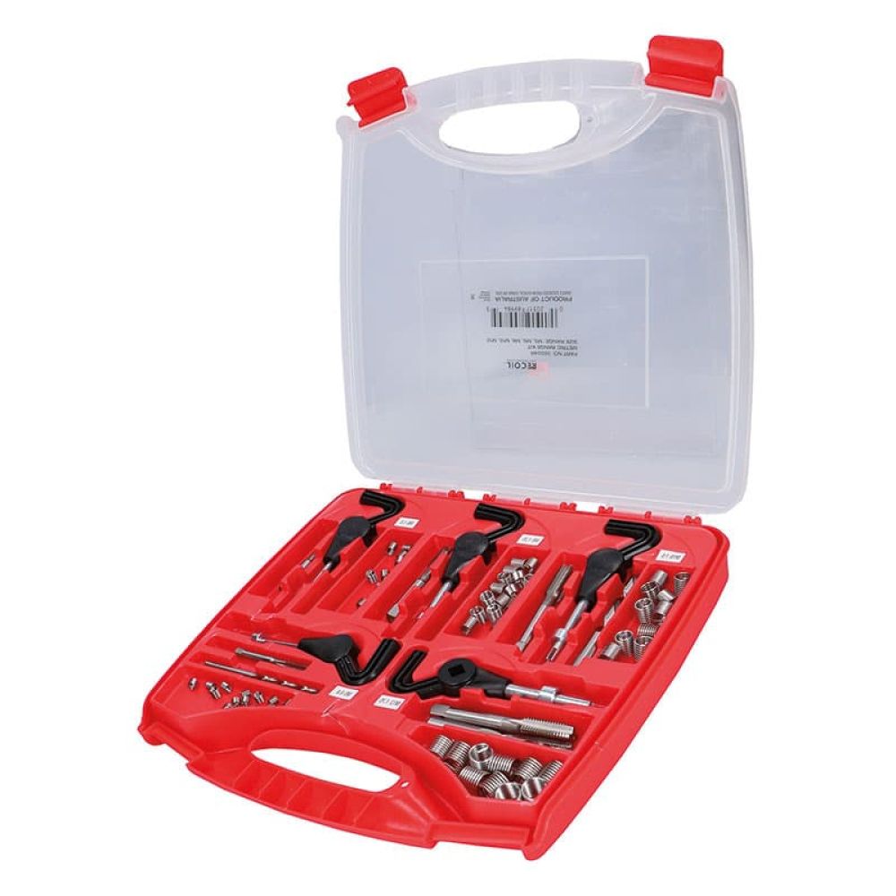 Assortment of threaded inserts M5x08, M6x1, M8x25, M10x1.5, M12x1.75.